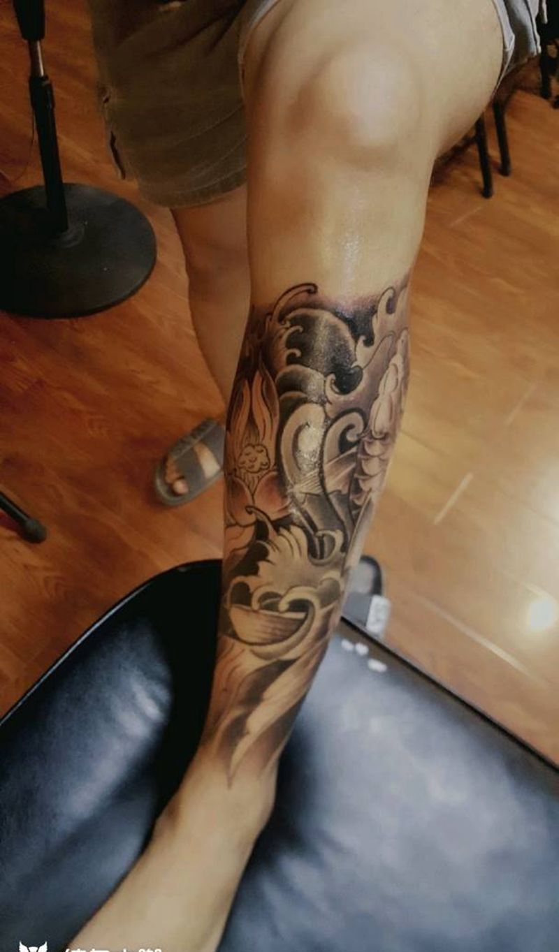 鲤鱼纹身图片_腿部脚部新传统老传统鱼荷花浪花纹身图案