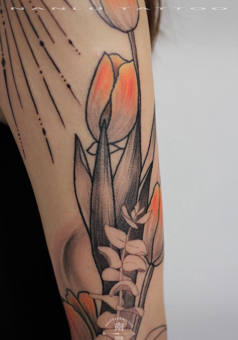 当前位置: 首页 >四川省自贡市纹身店-自贡南录刺青纹身图案>向阳而生纹身图片_水墨点刺郁金香太阳月亮纹身图案