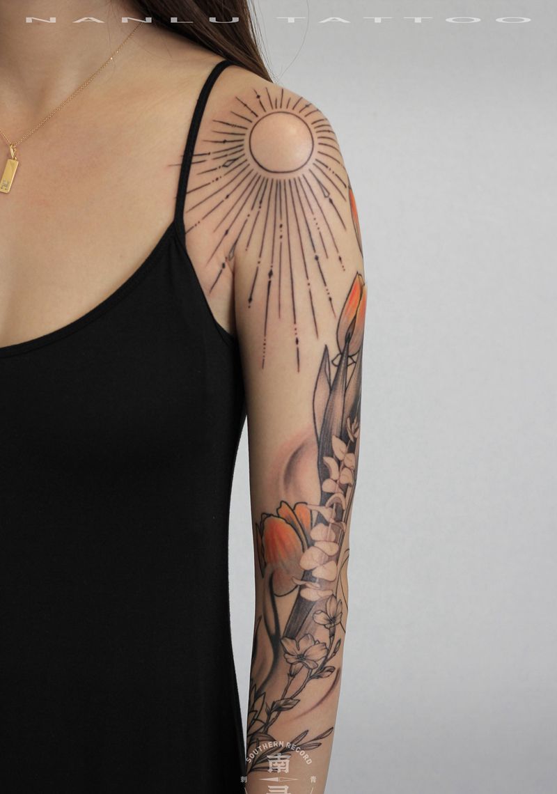 当前位置: 首页 >四川省自贡市纹身店-自贡南录刺青纹身图案>向阳而生纹身图片_水墨点刺郁金香太阳月亮纹身图案