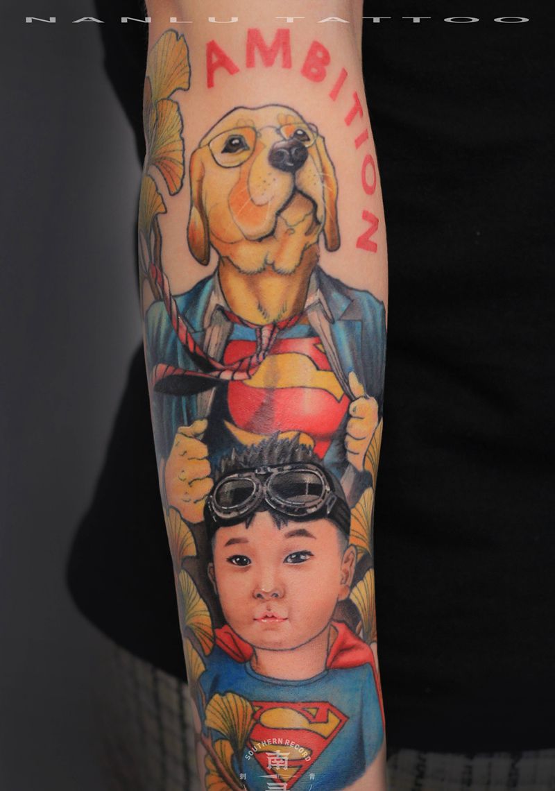 当前位置: 首页 >四川省自贡市纹身店-自贡南录刺青纹身图案>超级英雄纹身图片_手臂New School狗狗孩子纹身图案