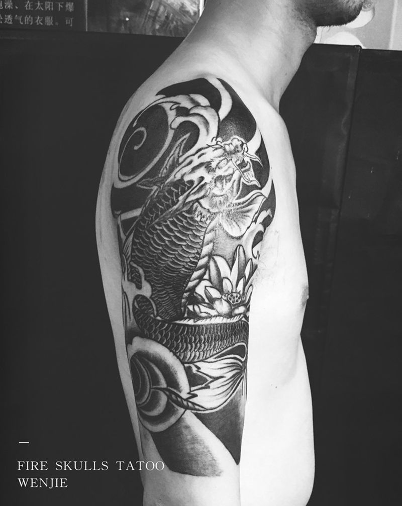 当前位置: 首页 >四川省自贡市纹身店-自贡南录刺青纹身图案>鳌鱼包大臂纹身图片_手稿成品手臂传统动物火骷髅纹身图案