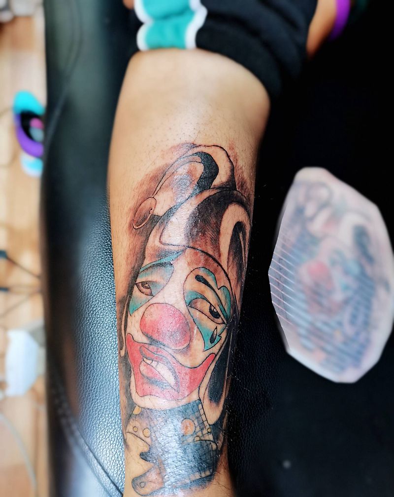 • T包小腿吹火男+阿多福纹身图片_腿部老传统新传统吹火男阿