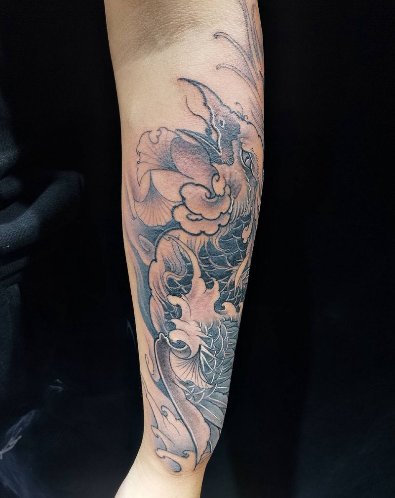 • T网红王老大花腿龙纹身图片_腿部新传统纹身图案
