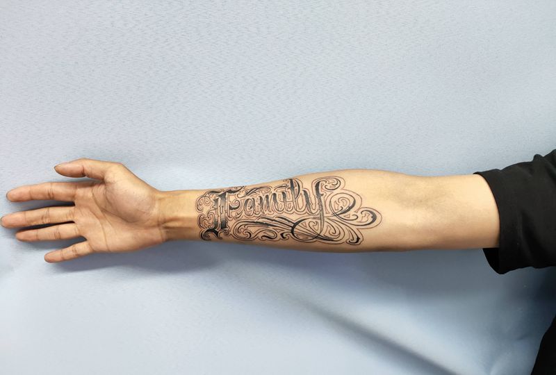 当前位置: 首页 >四川省自贡市纹身店-清晓刺青纹身图案>家庭纹身图片_手臂花体字纹身图案