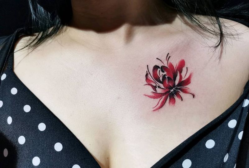彼岸花纹身图片_胸部水墨水彩纹身图案