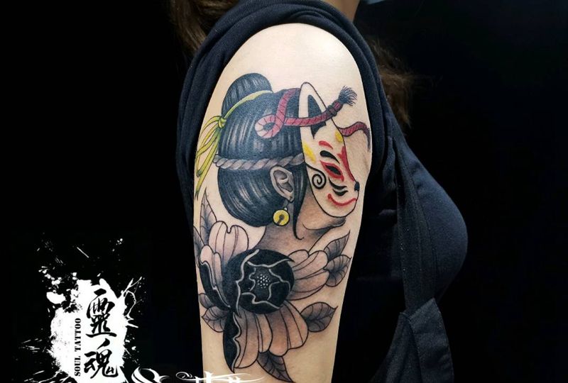 当前位置: 首页 >四川省德阳市纹身店-灵魂刺青纹身图案>面具+美女纹身图片_手臂New School纹身图案