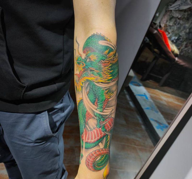 当前位置: 首页 >四川省德阳市纹身店-灵魂刺青纹身图案>龙纹身图片_手臂手部新传统龙纹身图案