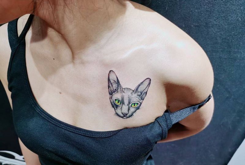 猫咪纹身图片_胸部欧美写实点刺纹身图案