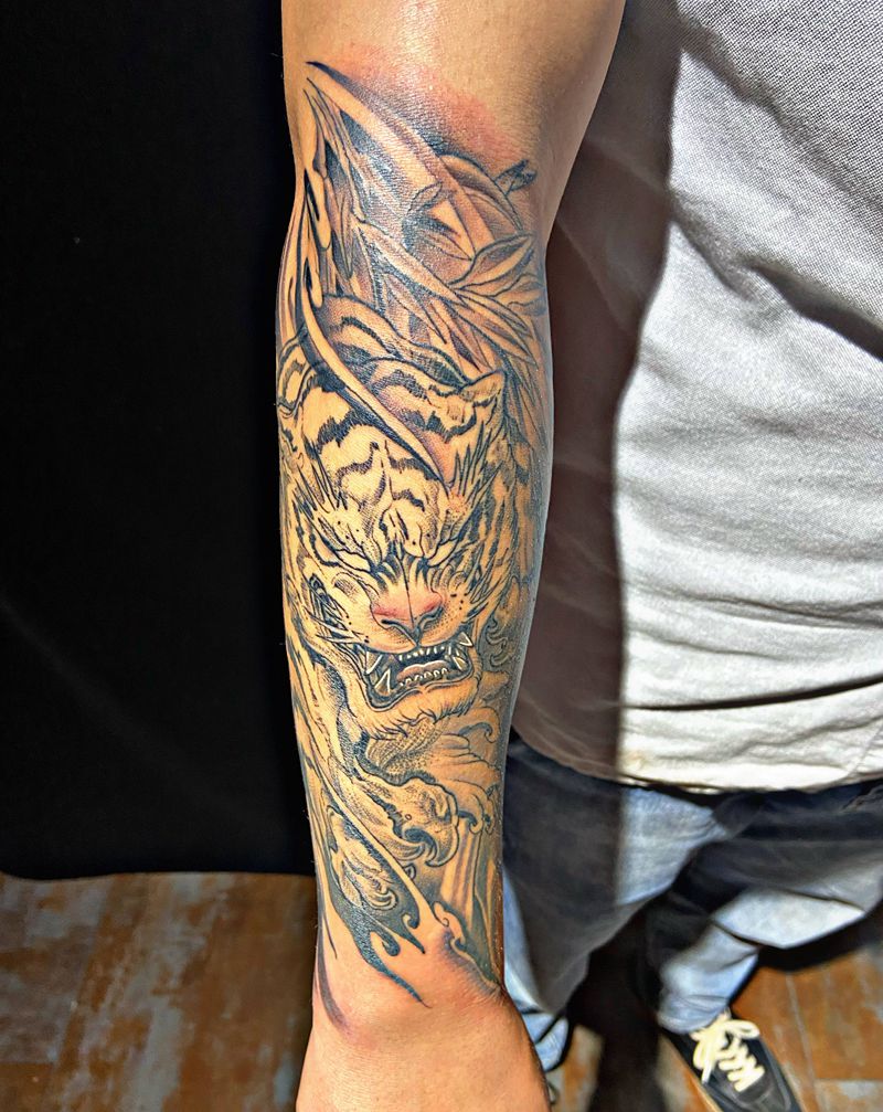 当前位置: 首页 >四川省德阳市纹身店-灵魂刺青纹身图案>老虎纹身图片_手臂手部新传统老虎 海浪纹身图案