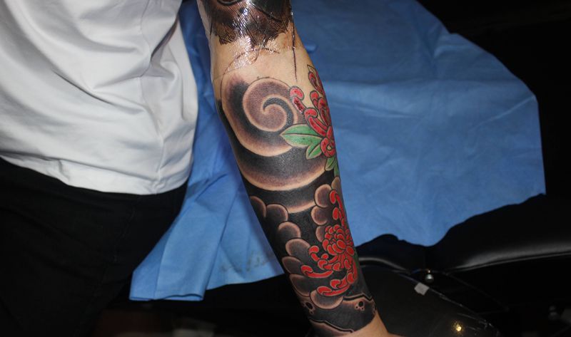当前位置: 首页 >四川省泸州市纹身店-四川泸州巫鸦纹身纹身图案>日式纹身图片_手臂老传统Old School泡泡云板雾日式纹身图案
