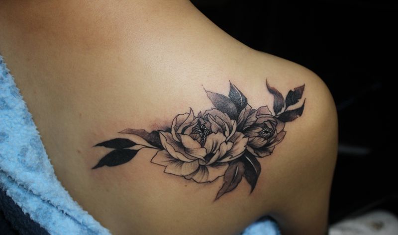 水墨牡丹纹身图片_背部肩部新传统水墨牡丹水墨女生纹身图案