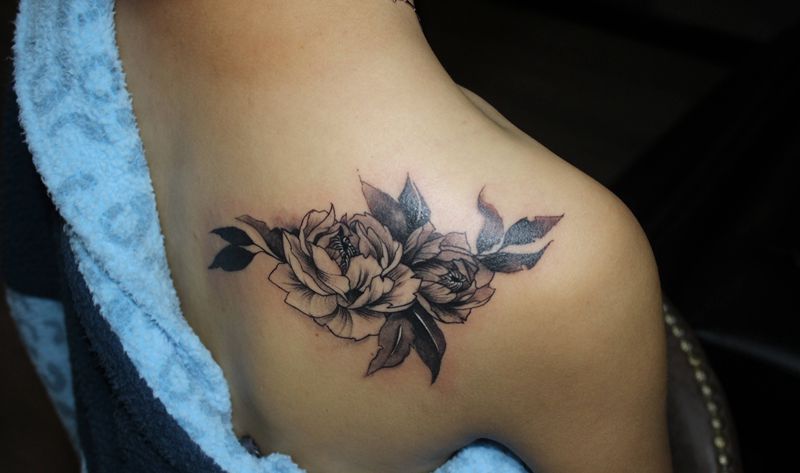 水墨牡丹纹身图片_背部肩部新传统水墨牡丹水墨女生纹身图案