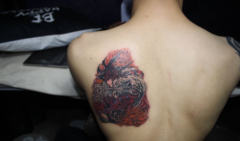 当前位置: 首页 >四川省泸州市纹身店-四川泸州巫鸦纹身纹身图案>地下城遮盖凤凰图腾纹身图片_背部肩部New School新传统地下城遮盖游戏纹身图案
