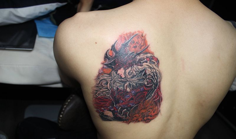 当前位置: 首页 >四川省泸州市纹身店-四川泸州巫鸦纹身纹身图案>地下城遮盖凤凰图腾纹身图片_背部肩部New School新传统地下城遮盖游戏纹身图案