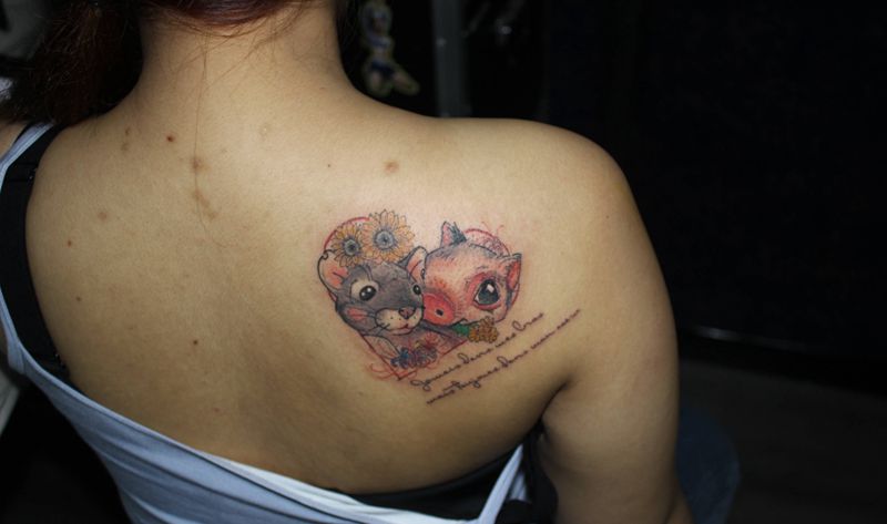 当前位置: 首页 >四川省泸州市纹身店-四川泸州巫鸦纹身纹身图案>生肖鼠猪纹身图片_肩部背部新传统New School鼠猪生肖纹身图案