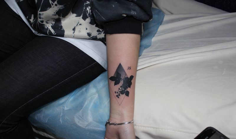 玫瑰叶遮盖纹身图片_手部水墨几何玫瑰叶子遮盖纹身图案