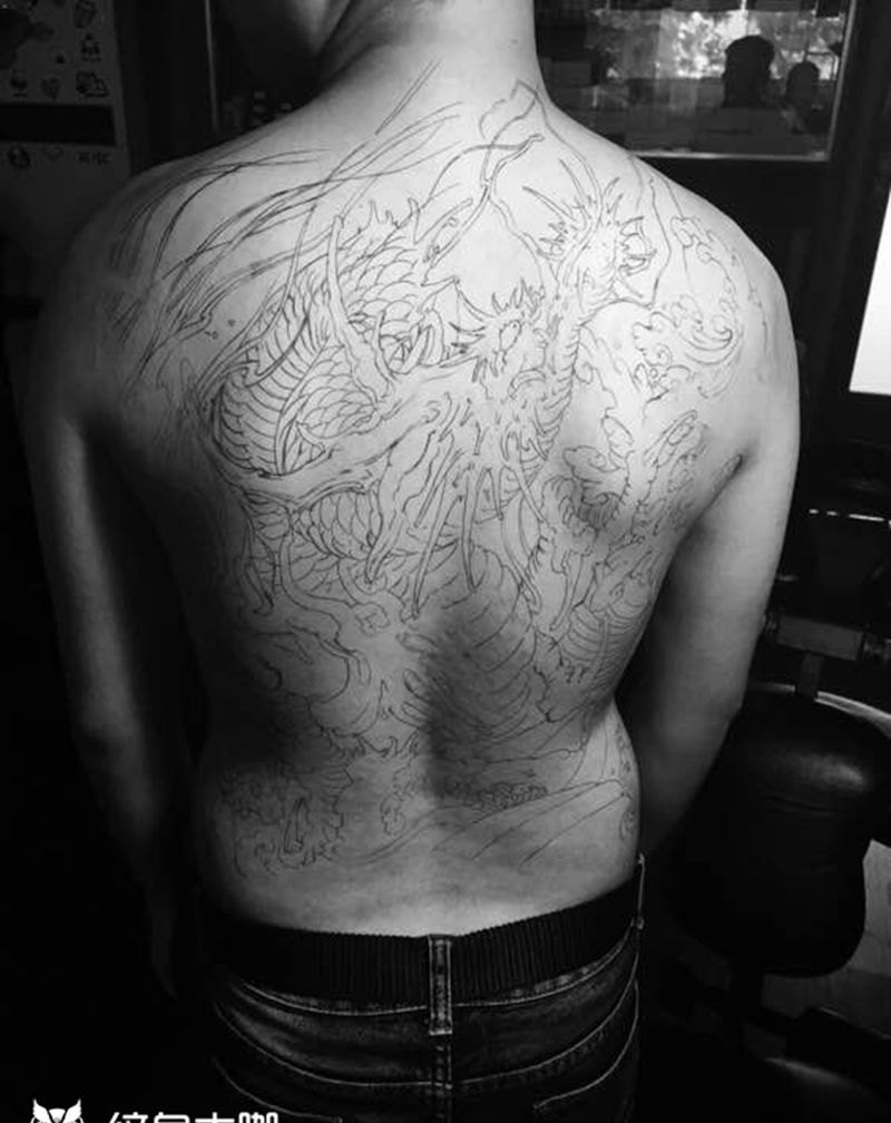 新传统大龙满背纹身图片_成品背部传统清新国画鬼神动物纹身图案
