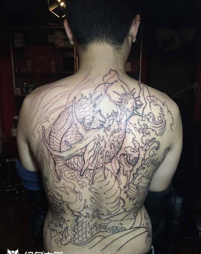 新传统大龙满背纹身图片_成品背部传统清新国画鬼神动物纹身图案