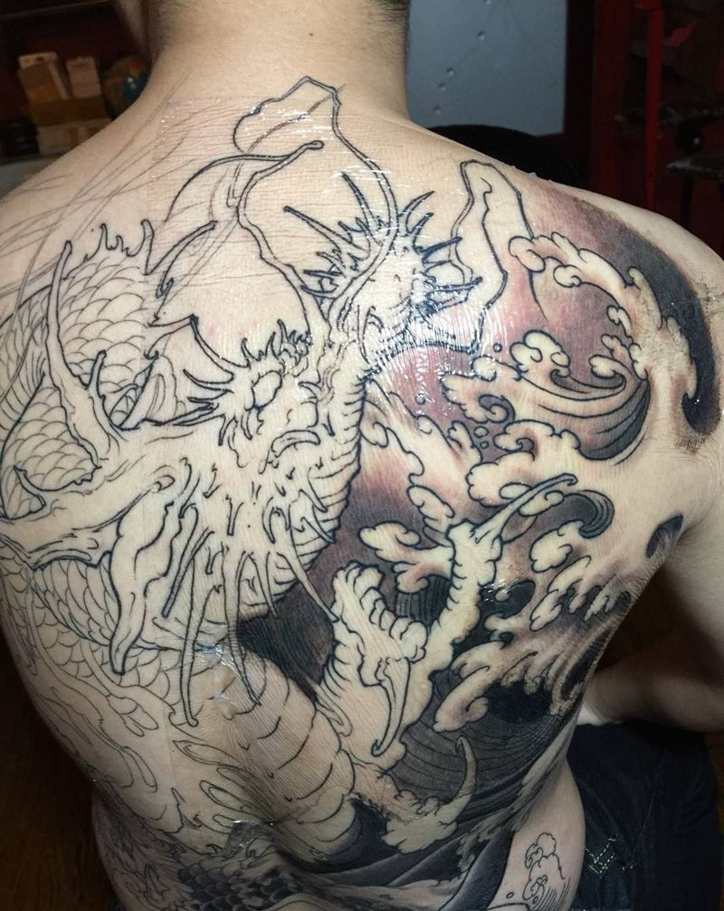 新传统大龙满背纹身图片_成品背部传统清新国画鬼神动物纹身图案