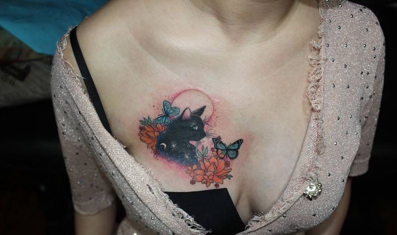 星空水彩猫遮盖纹身图片_胸部水彩New School纹身图案