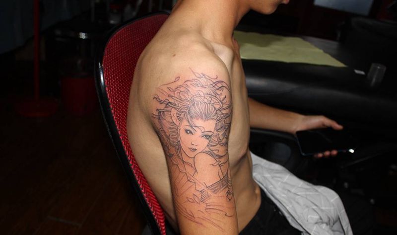 当前位置: 首页 >四川省泸州市纹身店-四川泸州巫鸦纹身纹身图案>志永艺伎纹身图片_手臂新传统水墨纹身图案