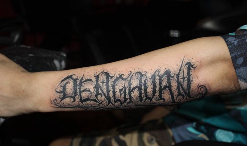 当前位置: 首页 >四川省泸州市纹身店-四川泸州巫鸦纹身纹身图案>暗黑花体字纹身图片_手臂花体字图腾纹身图案