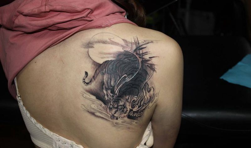 虎 遮盖纹身图片_背部新传统水墨纹身图案