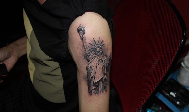 当前位置: 首页 >四川省泸州市纹身店-四川泸州巫鸦纹身纹身图案>自由女神纹身图片_手臂欧美写实New School自由女神纹身图案
