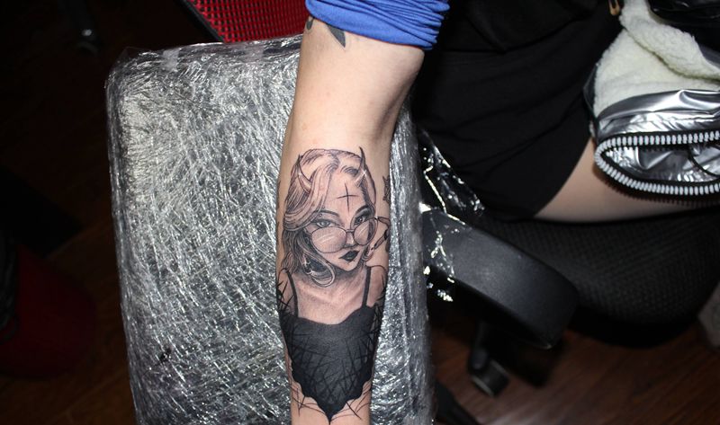 当前位置: 首页 >四川省泸州市纹身店-四川泸州巫鸦纹身纹身图案>暗黑客人自画像纹身图片_手臂欧美写实New School暗黑自己纹身图案