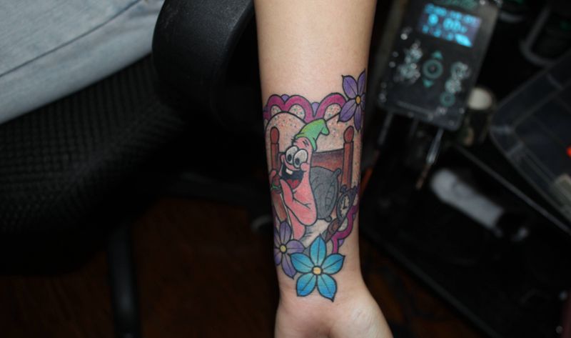 当前位置: 首页 >四川省泸州市纹身店-四川泸州巫鸦纹身纹身图案>派大星 盖纹身图片_手臂欧美写实水彩派大星纹身图案