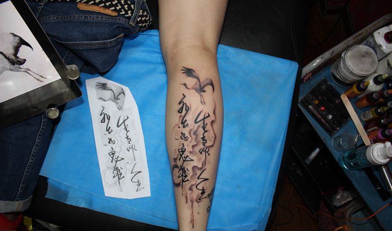 当前位置: 首页 >四川省泸州市纹身店-四川泸州巫鸦纹身纹身图案>鹤书法纹身图片_腿部水墨新传统鹤书法毛笔字纹身图案