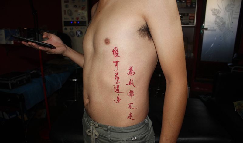 当前位置: 首页 >四川省泸州市纹身店-四川泸州巫鸦纹身纹身图案>侧腰毛笔字纹身图片_腰部水墨花体字汉字毛笔字纹身图案