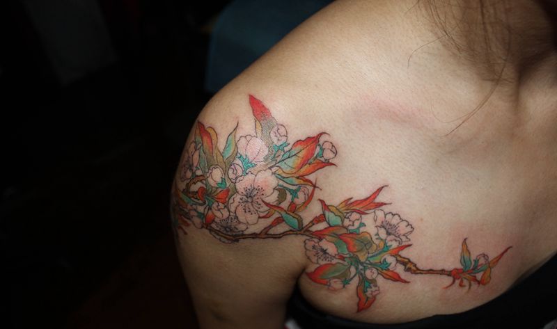 当前位置: 首页 >四川省泸州市纹身店-四川泸州巫鸦纹身纹身图案>彩色素花纹身图片_肩部新传统水彩素花彩色素花过肩纹身图案