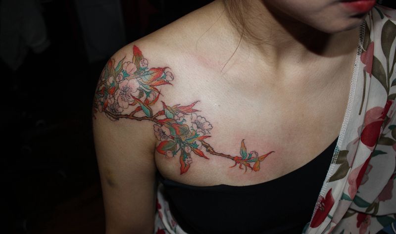 当前位置: 首页 >四川省泸州市纹身店-四川泸州巫鸦纹身纹身图案>彩色素花纹身图片_肩部新传统水彩素花彩色素花过肩纹身图案