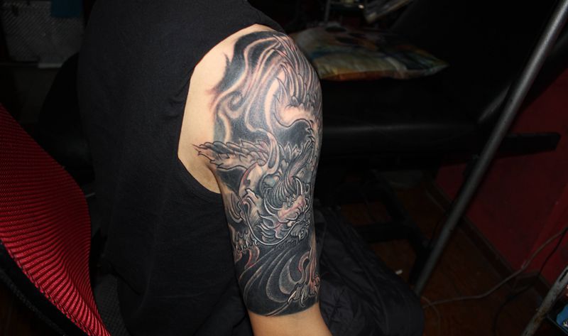 • T网红王老大花腿龙纹身图片_腿部新传统纹身图案
