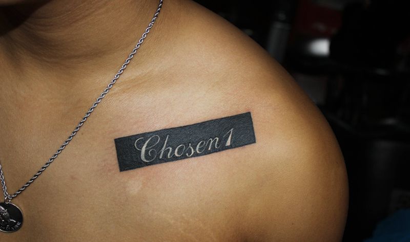 英文盖英文纹身图片_胸部花体字New School英文遮盖纹身图案