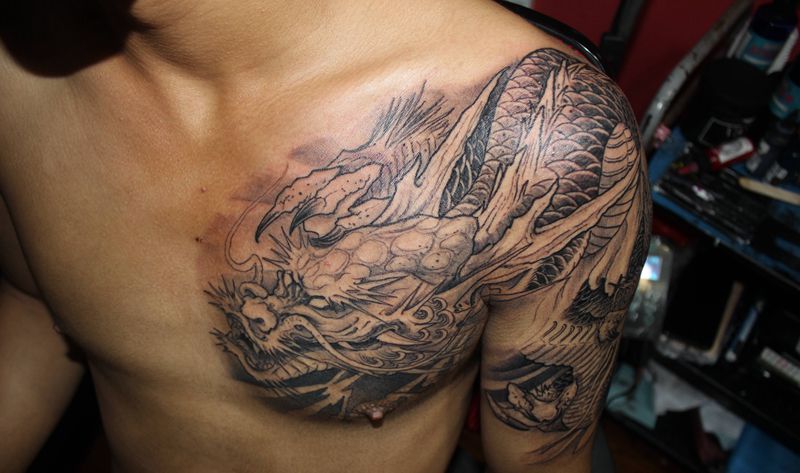 当前位置: 首页 >四川省泸州市纹身店-四川泸州巫鸦纹身纹身图案>龙纹身图片_胸部新传统New School过肩龙半甲纹身图案