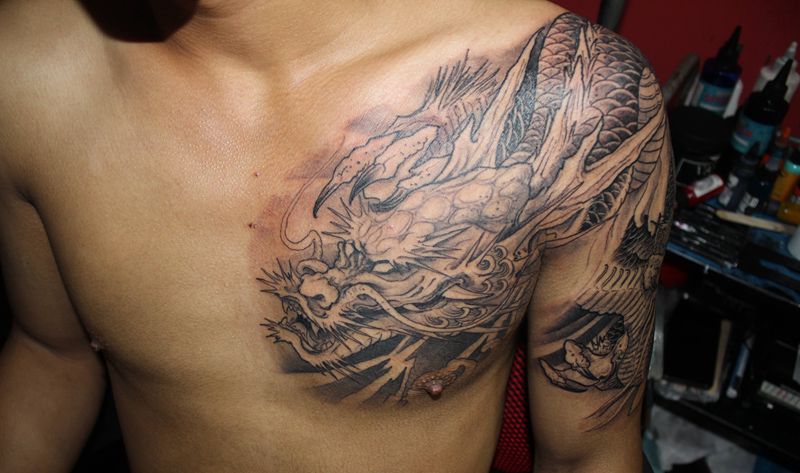 当前位置: 首页 >四川省泸州市纹身店-四川泸州巫鸦纹身纹身图案>龙纹身图片_胸部新传统New School过肩龙半甲纹身图案