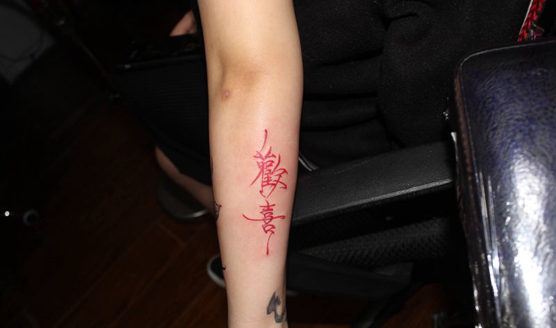 当前位置: 首页 >四川省泸州市纹身店-四川泸州巫鸦纹身纹身图案>欢喜纹身图片_手臂花体字水墨毛笔字汉字中国风纹身图案