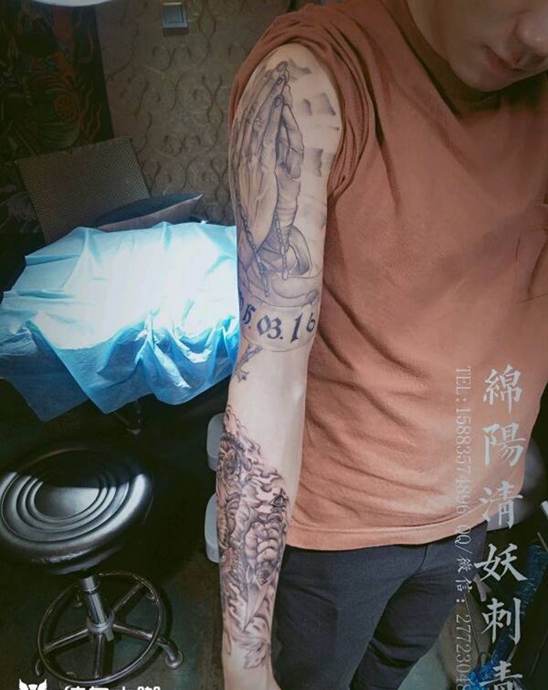 当前位置: 首页 >四川省绵阳市纹身店-绵阳清妖刺青纹身店纹身图案>花臂纹身,祈祷之手,象神纹身,纹身图片