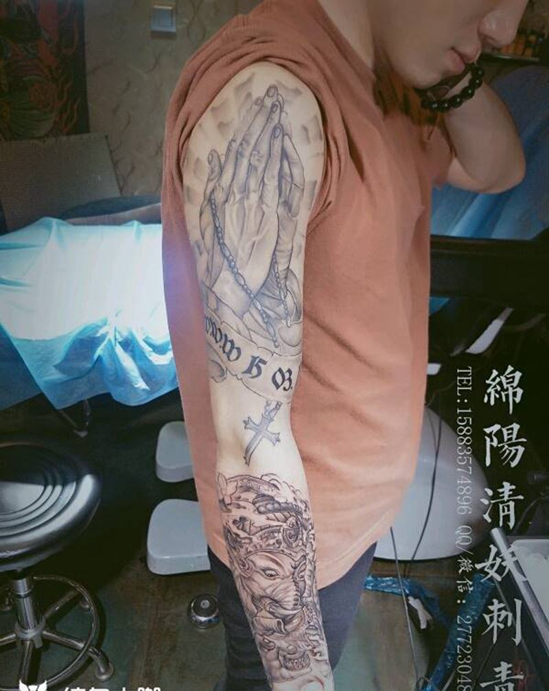 花臂纹身,祈祷之手,象神纹身,纹身图片