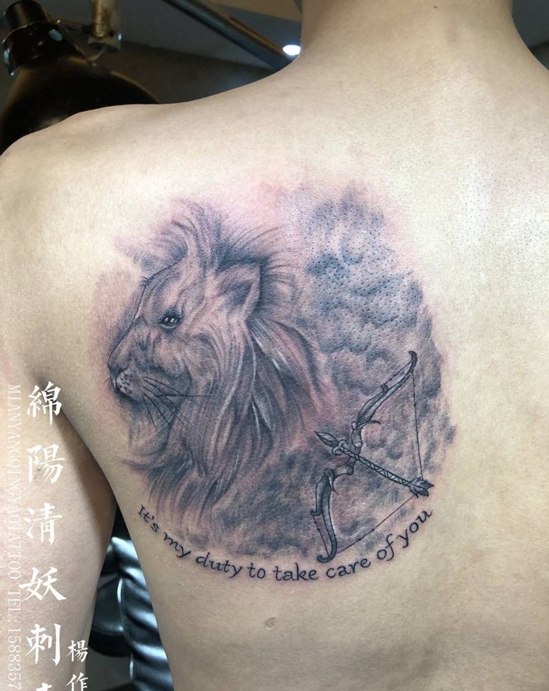 当前位置: 首页 >四川省绵阳市纹身店-绵阳清妖刺青纹身店纹身图案>狮子座射手纹身,专门为帅哥设计的比较温柔的狮子纹身图片