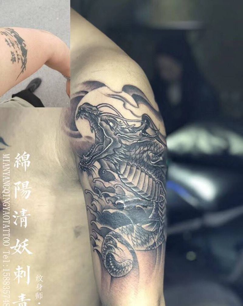 • T网红王老大花腿龙纹身图片_腿部新传统纹身图案