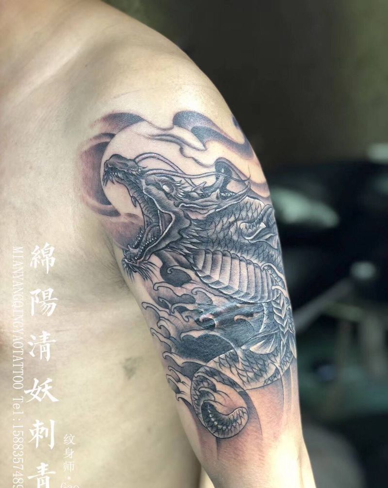 • T网红王老大花腿龙纹身图片_腿部新传统纹身图案