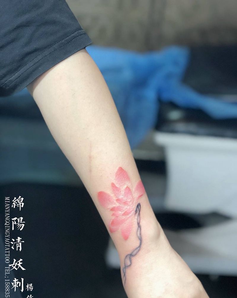 手臂荷花纹身,遮盖老旧烟疤。 店长-杨作品纹身图片