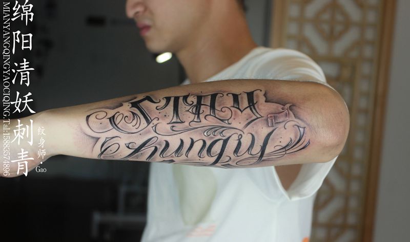 当前位置: 首页 >四川省绵阳市纹身店-绵阳清妖刺青纹身店纹身图案>花体字纹身图片_手臂花体字纹身图案