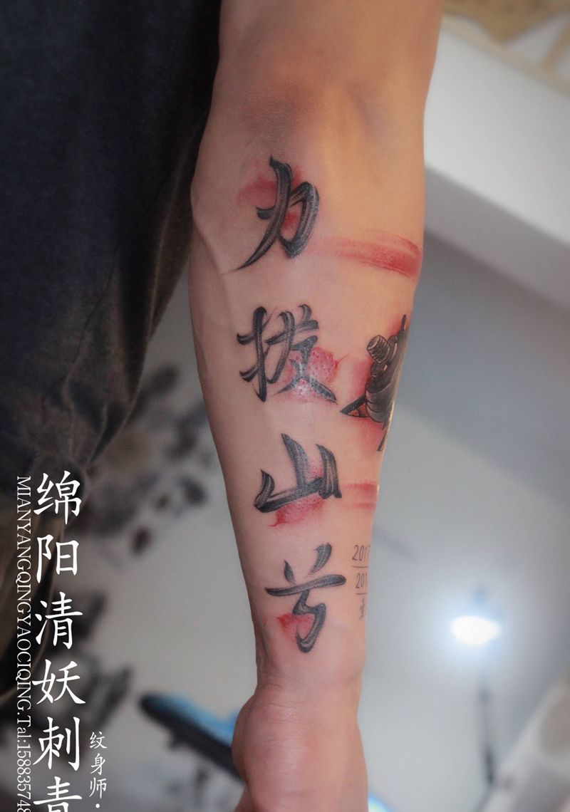当前位置: 首页 >四川省绵阳市纹身店-绵阳清妖刺青纹身店纹身图案>汉字,哑铃纹身图片_手臂水墨纹身图案