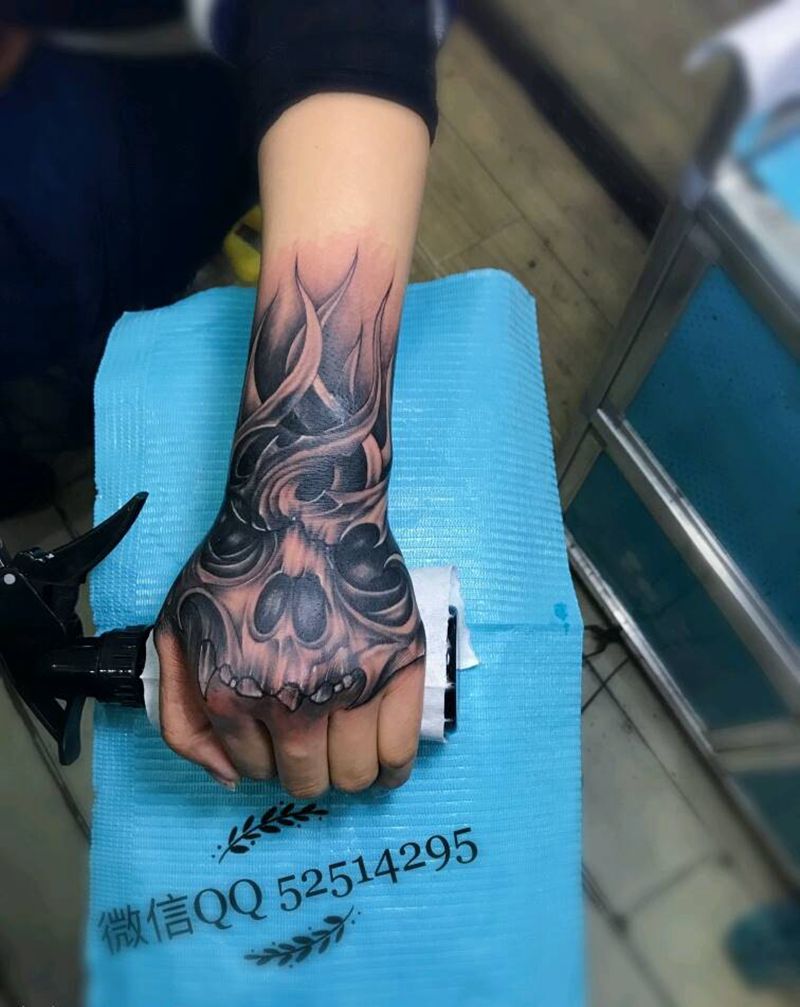 手面骷髅遮盖完成纹身图片