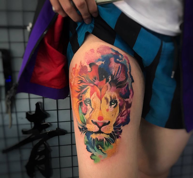 当前位置: 首页 >四川省内江市纹身店-内江零玖刺青纹身图案>狮子纹身图片_腿部水彩纹身图案