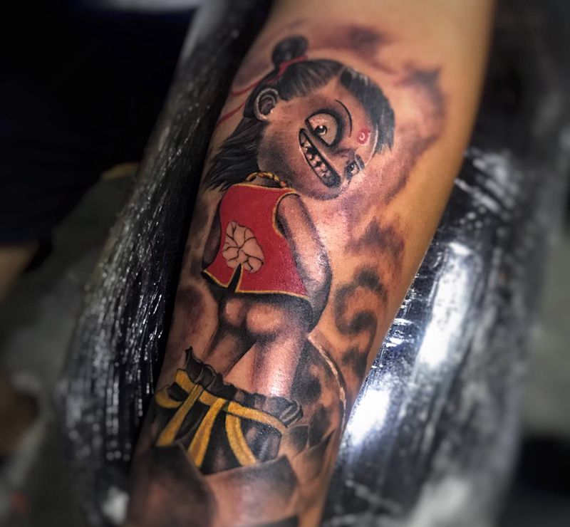 • T包小腿吹火男+阿多福纹身图片_腿部老传统新传统吹火男阿